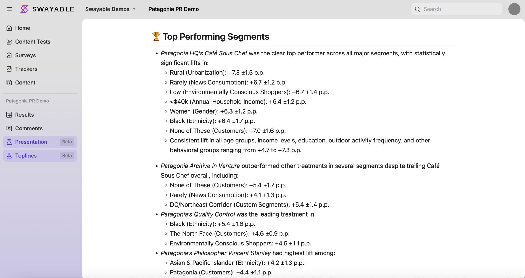 Marketers use Swayable to measure the metrics that define their campaigns’ success, and identify what’s driving lift among target segments versus what’s not. Access to this trove of real-time results is crucial to make informed creative decisions. But if you’re seeking to spotlight the most relevant insights right away, some may be more evident than others—perhaps one unexpected subsegment is overperforming, or another is showing backlash. AI-generated toplines are designed to surface these insights intelligently and instantly.