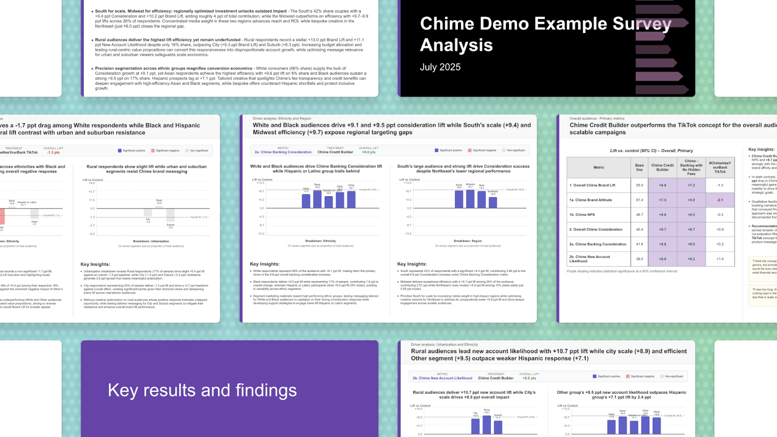 This capability, currently rolled out to enterprise users on larger plans, generates presentations with carefully structured slides and sections that summarize test findings in a customized format—optimized for sharing with cross-functional teams, executives, and agency partners. These users can even direct Analysis Factory to focus on specific metrics, audiences, and analyses to include in the slide outputs, based on the specific goals of each round of testing.