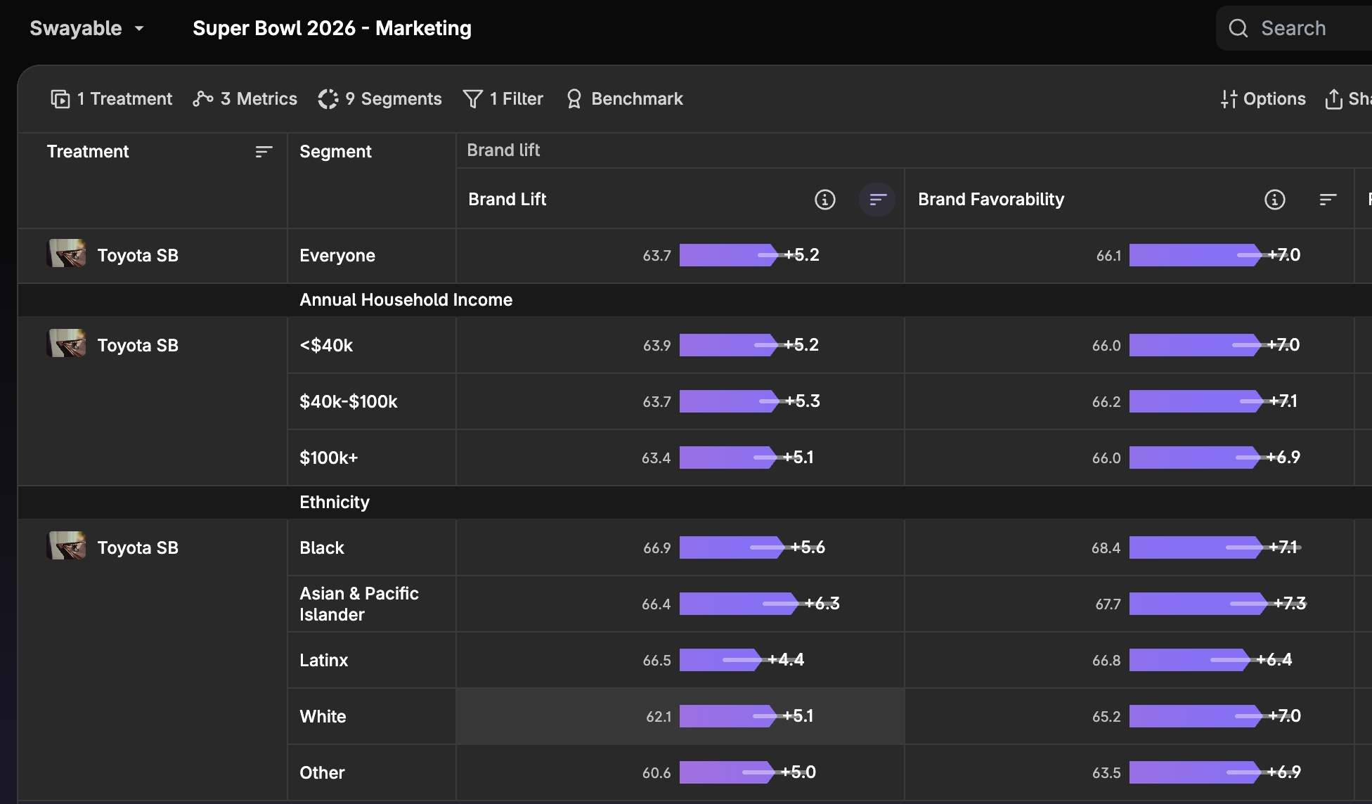 While many automakers skipped the Super Bowl this year, Toyota’s ad proved to pay off. The ad was most persuasive across all brands and categories that Swayable tested, driving the highest increases in lift, favorability, and likelihood to recommend across all audiences, household income categories, and ethnicities. The ad performed particularly well among Asian audiences, highlighting the power of representation as the story focuses on an Asian family.