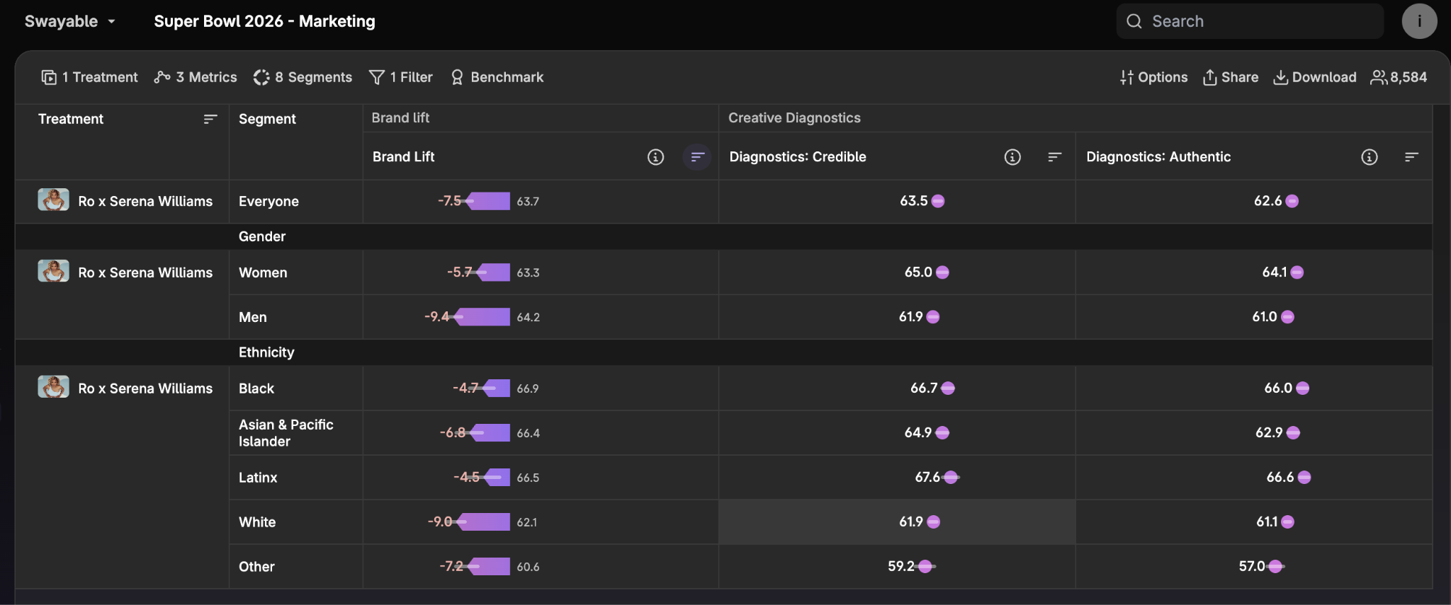 The ad scored 8-9 points lower on these trust metrics versus the top performer, Toyota. This gap is notable because Serena Williams is a real person with real reasons for using Ro, yet most segments didn’t perceive the ad as authentic—suggesting it may have come off as a transactional endorsement rather than a genuine story.