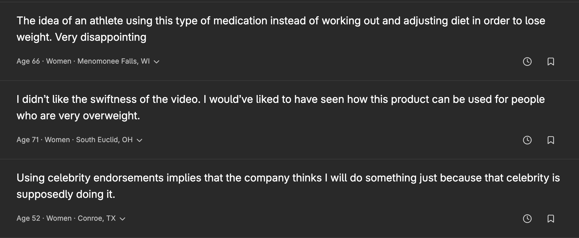 Qualitative responses (shown below) also revealed sensitivities about weight-loss medication and questioned the use of a celebrity athlete to endorse the product: