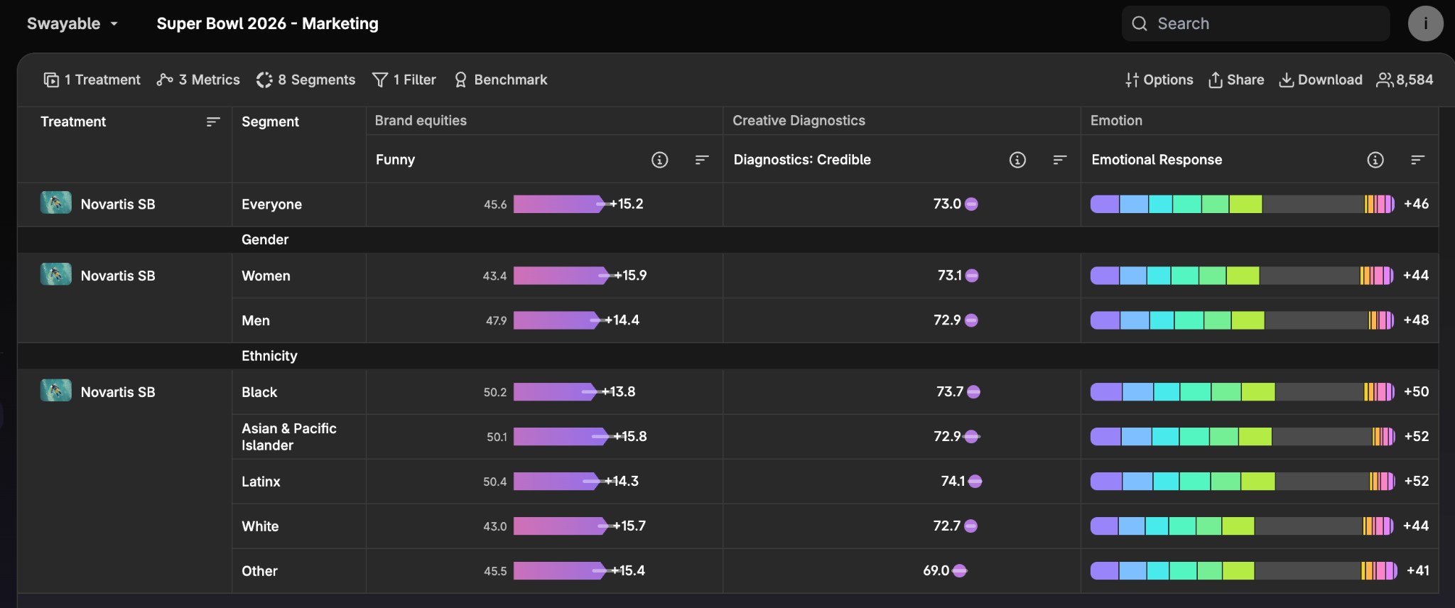 The other ads we tested—from Hellmann’s, Novartis, and Budweiser—generated minor lift across key metrics including favorability and purchase intent, while scoring better across emotional response metrics such as humor, authenticity, and memorability.