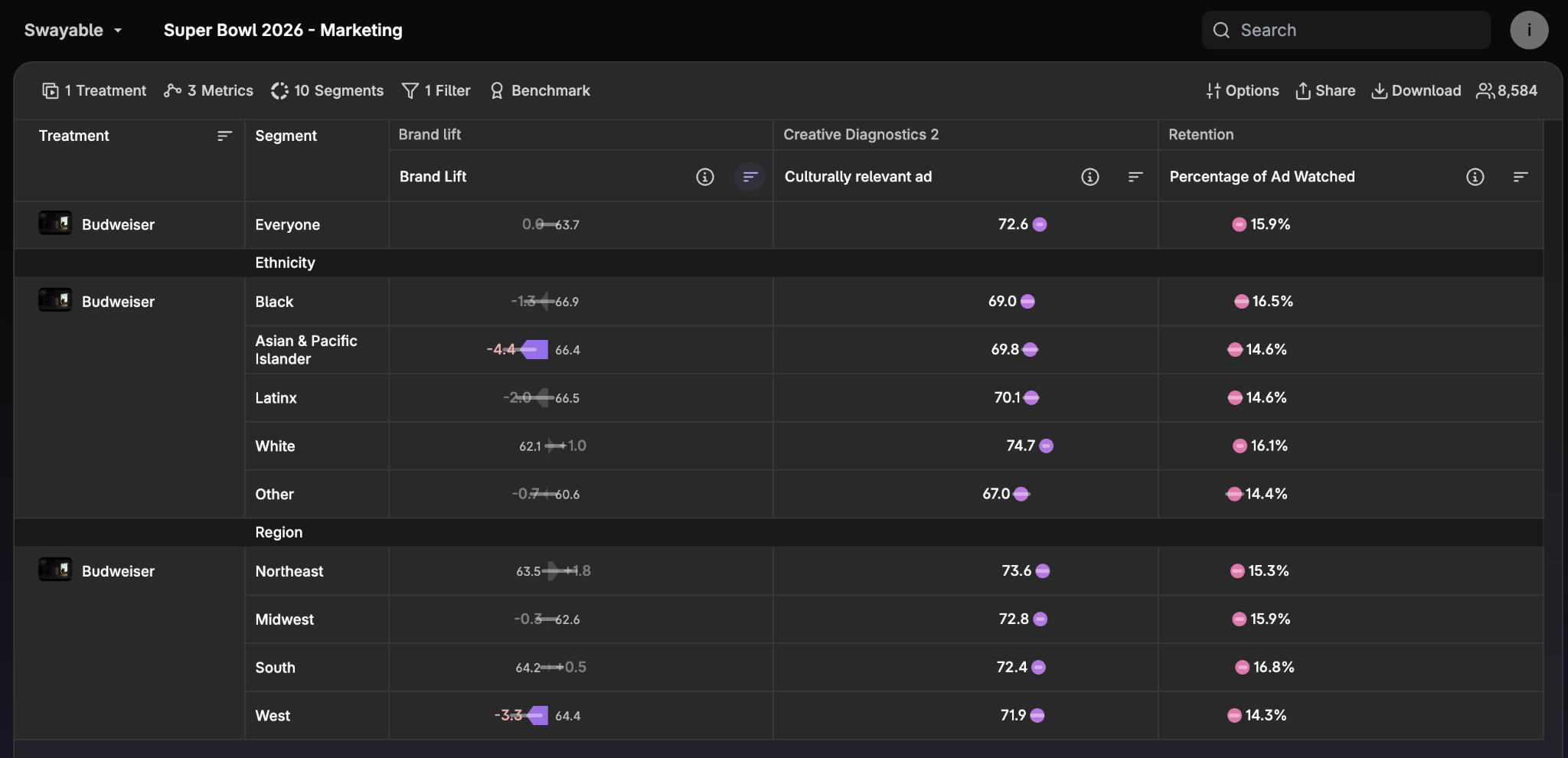 Results showed that a segment of viewers checked out early—16% watched the full ad versus those who viewed Toyota’s in full (22%). The ad also drove slightly positive lift among white audiences, while generating negative lifts across the board for non-white audiences. Responses to Budweiser's patriotic, heritage-focused narrative demonstrate that its formula could benefit from a creative refresh, allowing the brand to reach a more diverse audience and capture their attention more quickly.
